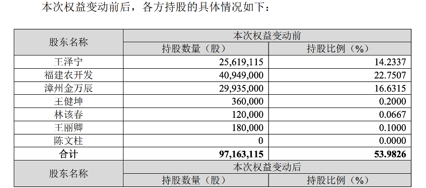 同时,王泽宁、福建农开发、漳州金万辰以及王泽宁的近亲属王健坤及林该春仍构成一致行动关系,合计持有公司股数为9698万股,合计持股比例为53.8826%,确认王泽宁为实际控制人。
